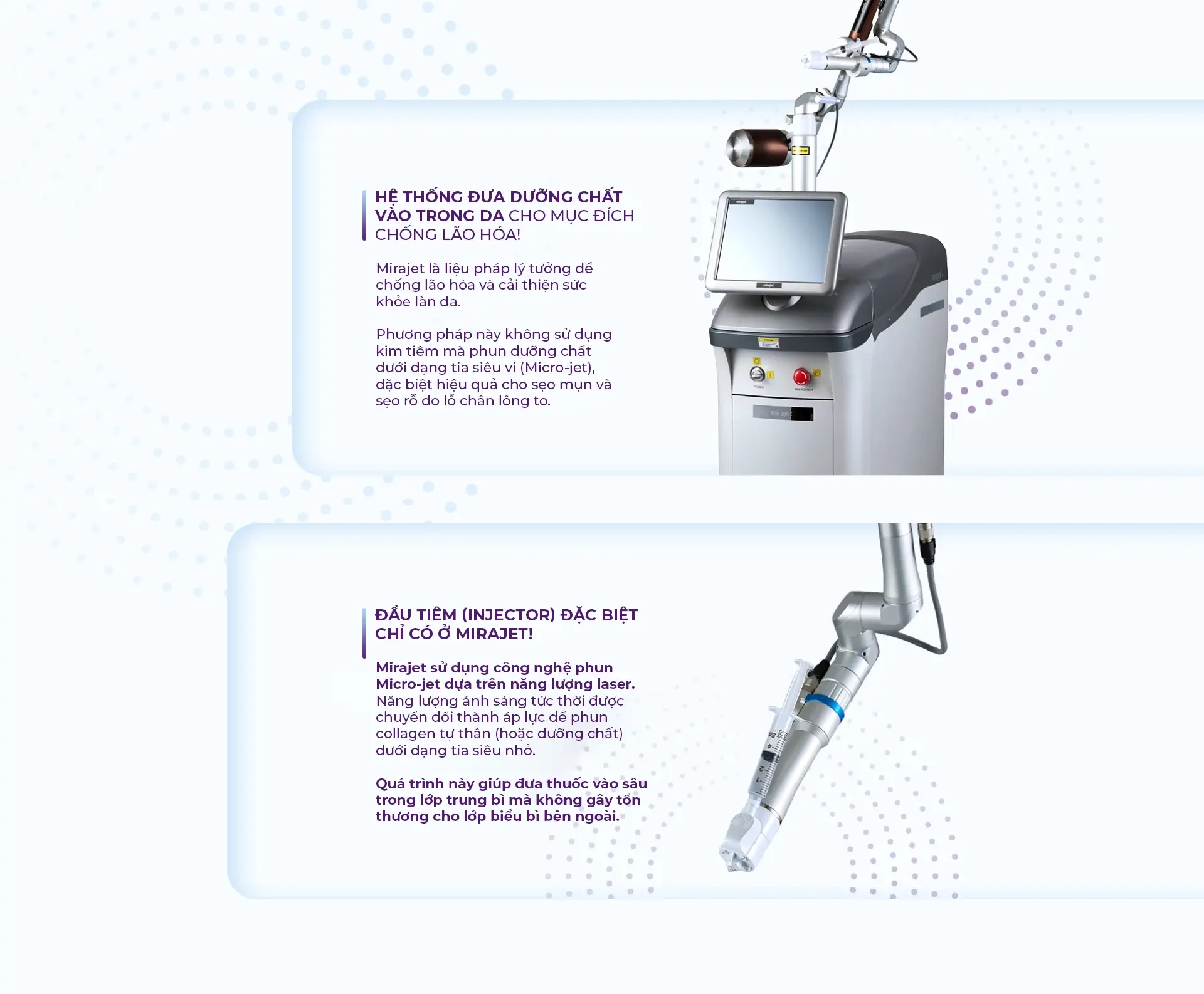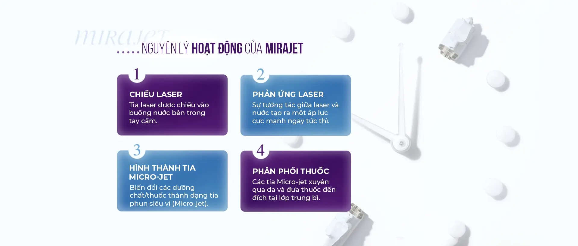 Mirajet là hệ thống truyền thuốc (dưỡng chất) cải tiến, áp dụng công nghệ phun Micro-jet dựa trên cơ chế áp lực laser.